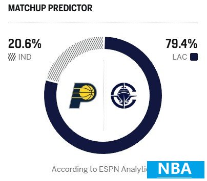 今日ESPN给出本场胜率预测,快船高达79.4%,步行者只有20.6%。